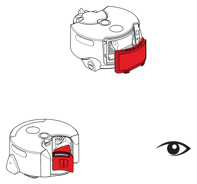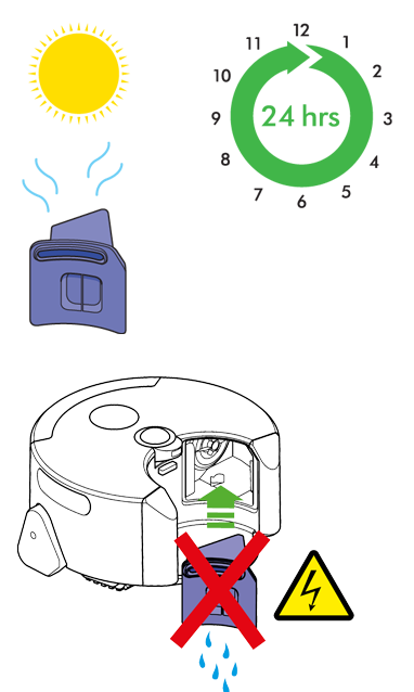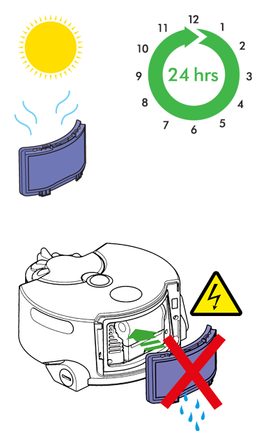 让滤网自然晾干(至少 24 小时)。装回滤网:把滤网底部的卡条对准吸尘机器人的卡槽,轻推滤网顶部,使滤网归位。向下滑动滤网网罩。