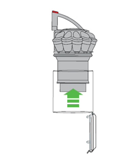 • 将集尘桶与气旋组件放置在机身前面。集尘桶的底座凹槽必须恰好置于定位支架凸起处。