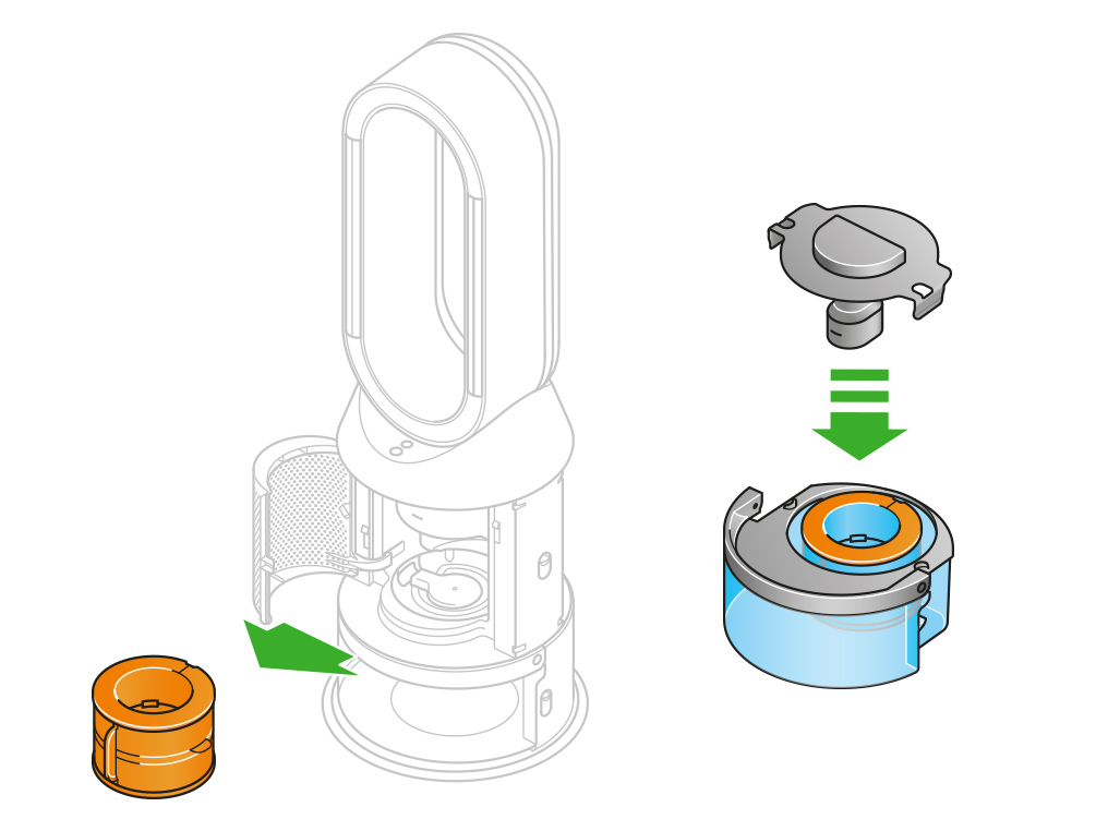 将蒸发器装回机器,确保锁定到位。关掉内门,安装滤网网罩。将水箱划入机器,牢固卡入位置。