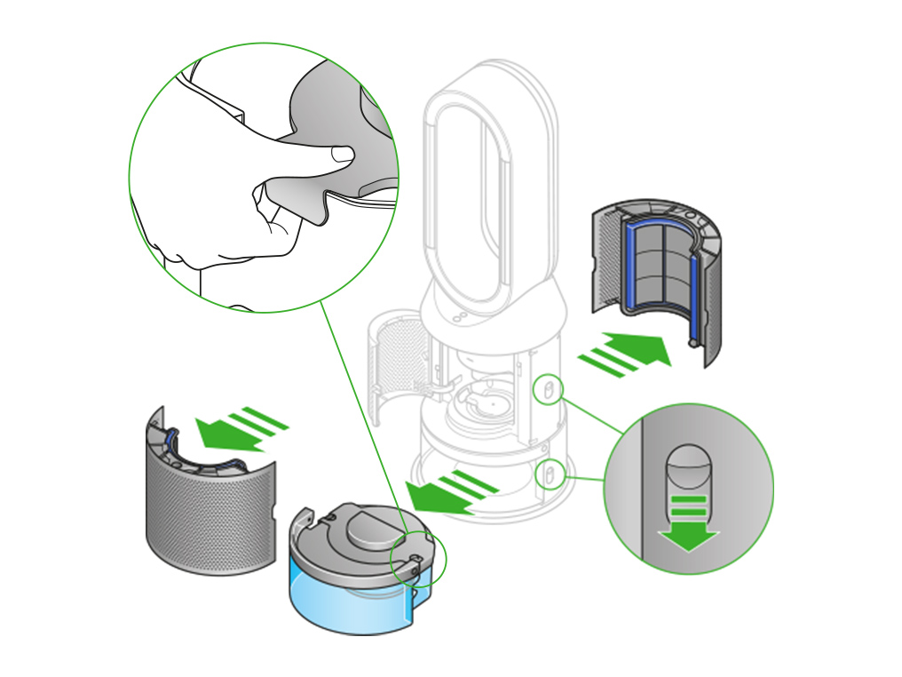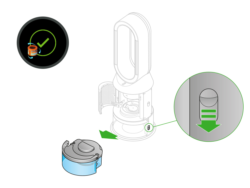 在加湿空气净化风扇的两侧按下释放按钮,取下水箱。将水箱划出机器,打开盖子。